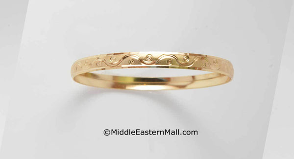 The bangle opening is 2.875" (7.3 cm) wide or 8.75" (22.22 cm) around and 7mm thick.